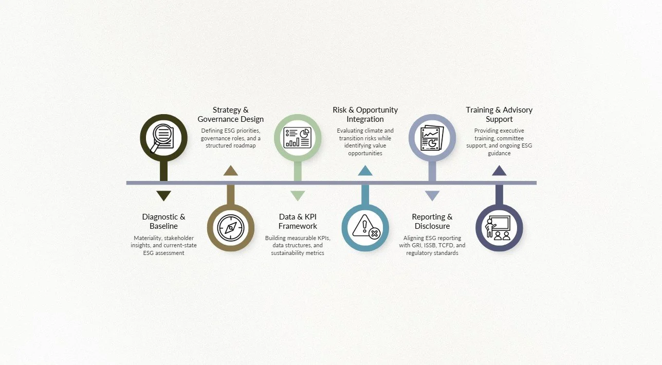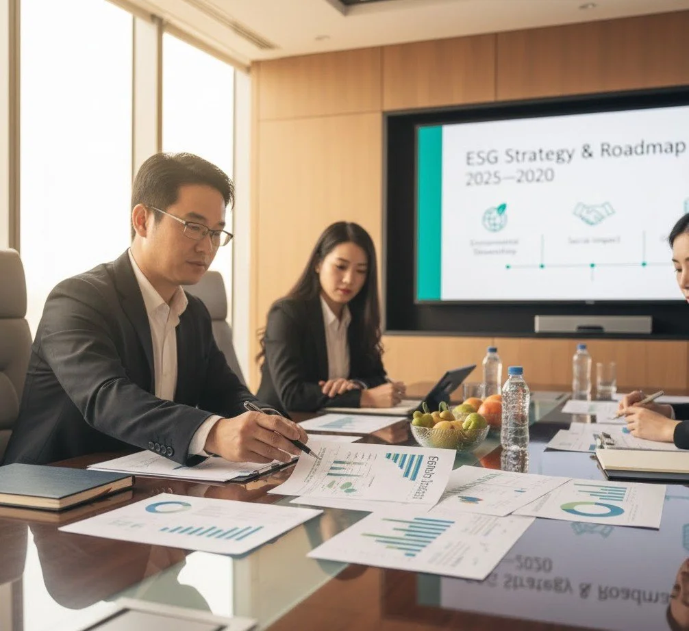 Supporting board-level ESG governance, sustainability committees, executive training, and stakeholder communication frameworks to strengthen oversight, alignment, and transparent sustainability management.