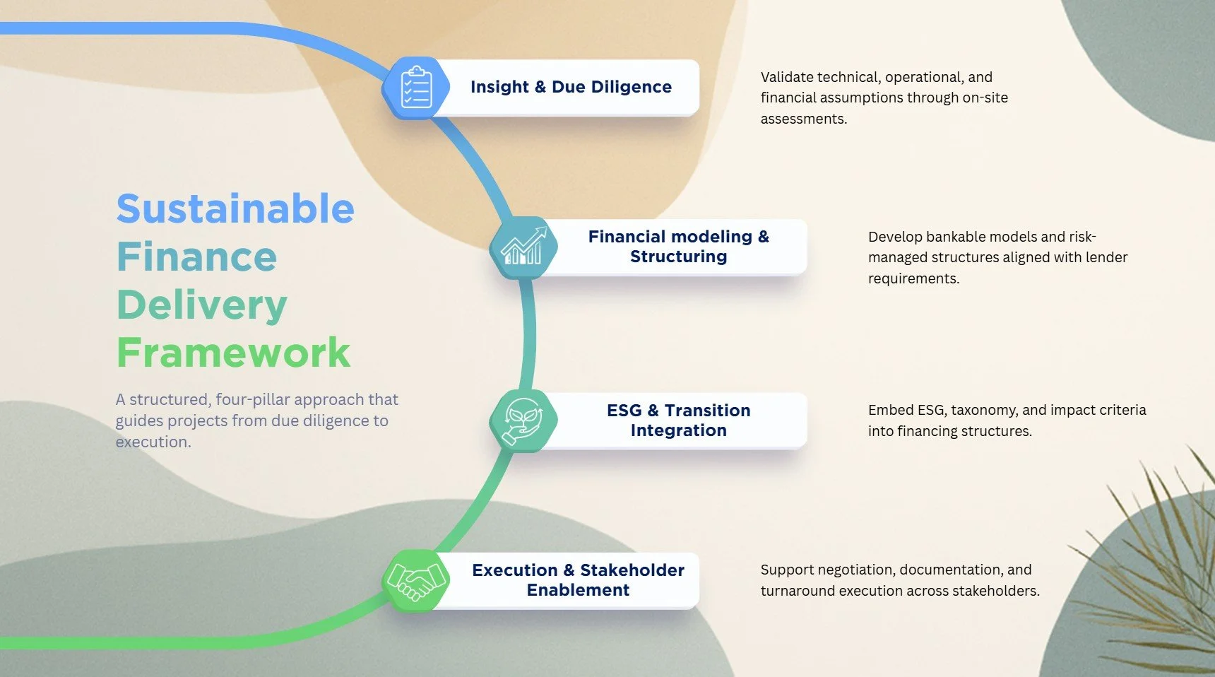 We blend financial modeling, on-site due diligence, and risk-managed structuring to create bankable, transparent financing solutions aligned with global sustainable finance standards. Our end-to-end support—from feasibility to execution—helps stakeholders secure capital, mitigate risks, and accelerate project delivery.